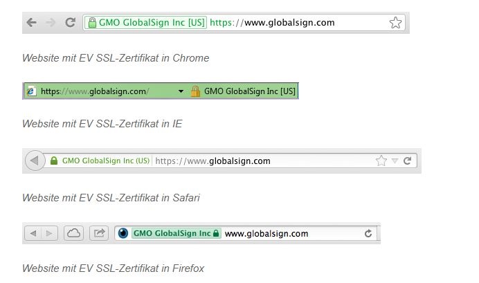 As described, the goal of an SSL certificate is to provide the user with the assurance that he is on a protected website. In order to convey this information as simply and visibly as possible, EV certificates not only use a lock icon in the browser's address bar, but also display the verified legal identity of the domain in the address bar with a field highlighted in green. Legal identity here means the company name of the company for which the certificate was issued (see examples below).