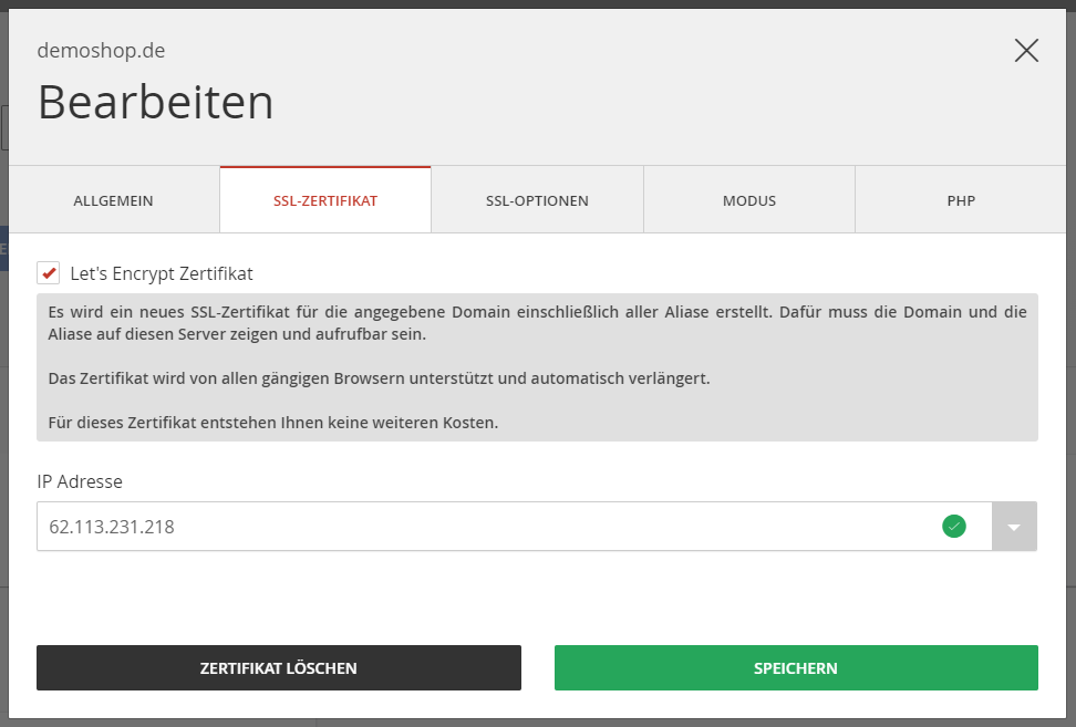 Then check the "Let's Encrypt certificate" box and confirm your IP address. We also recommend checking "Automatically forward to SSL" and "Monitor expiration date of certificate", as this will enable maxcluster support to monitor your certificates. We recommend this because it allows our support to react quickly in case of an error or an expiring certificate. If, for example, the Certbot from Let's Encrypt should fail to renew a certificate automatically, we can react accordingly in support so that you are always comprehensively secured.