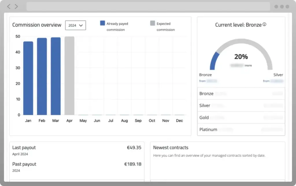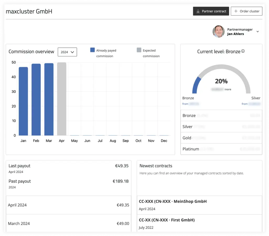As a partner manager, you always want to be up to date about your customers and your commission development. Our partner portal is conveniently accessible via the Application Center and provides you with relevant information at a glance: