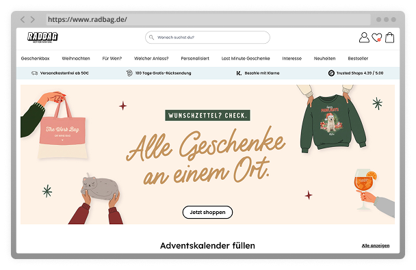 Bei RADBAG gibt es lustige Geschenke zu Weihnachten, romantische Geschenke zum Valentinstag oder zur Hochzeit, abgefahrene Geburtstagsgeschenke sowie kultige und witzige Geschenkideen für viele andere Anlässe. Ob coole Geschenkideen für Männer, Frauen oder Kinder – hier "findet jeder etwas. Das RADBAG-Team sucht laufend auf der ganzen Welt nach intelligenten und skurrilen Lifestyle-Accessoires fürs Zuhause, für das Büro, für Outdoor-Aktivitäten – und natürlich nach technischen Spielereien für Geeks, die nicht erwachsen werden wollen.