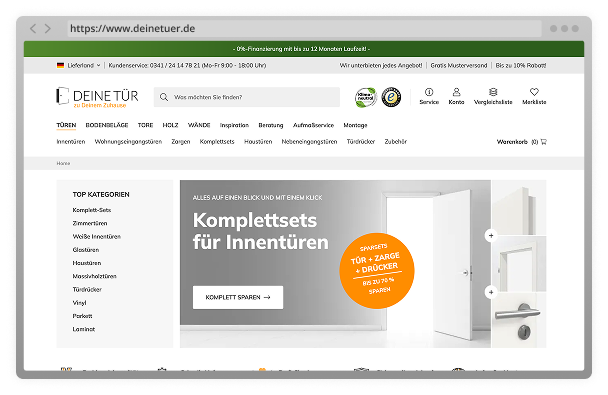 Im Onlineshop von DEINE TÜR kann der Kunde auf das größte Türen-Angebot im deutschsprachigen Raum zurückgreifen. Neben unzähligen Konfigurationsmöglichkeiten für Außen- und Innentüren, bietet DEINE TÜR außerdem ein umfangreiches Sortiment an Zubehör und darüber hinaus Marken-Fußbodenbeläge und Fliesen. Vom Standort Leipzig aus kümmern sich die Mitarbeiterinnen und Mitarbeiter um die Handelsplattform und den weltweiten Versand der Produkte.