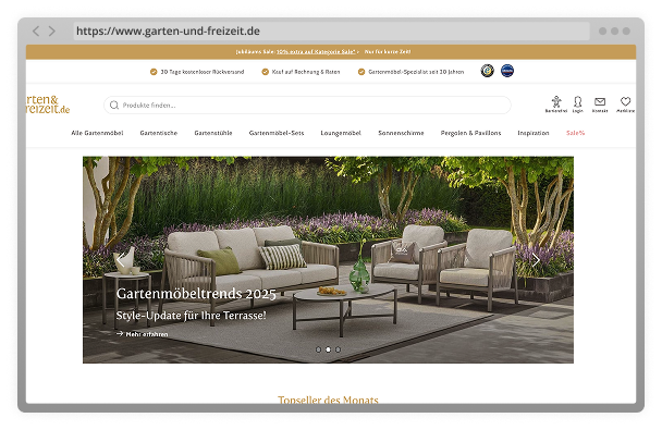 Garten-und-Freizeit.de ist der führende deutsche Fachhändler für hochwertige Garten- und Freizeitmöbel. Das Portfolio des Onlineshops umfasst zurzeit über 15.000 verschiedene Produkte von Tischen, Stühlen oder Bänken über Loungemöbel bis hin zu Liegen und Pavillons. Neben den detaillierten Angaben zu den einzelnen Artikeln bietet Garten-und-Freizeit.de auch verschiedene allgemeine Informations- und Beratungsangebote.