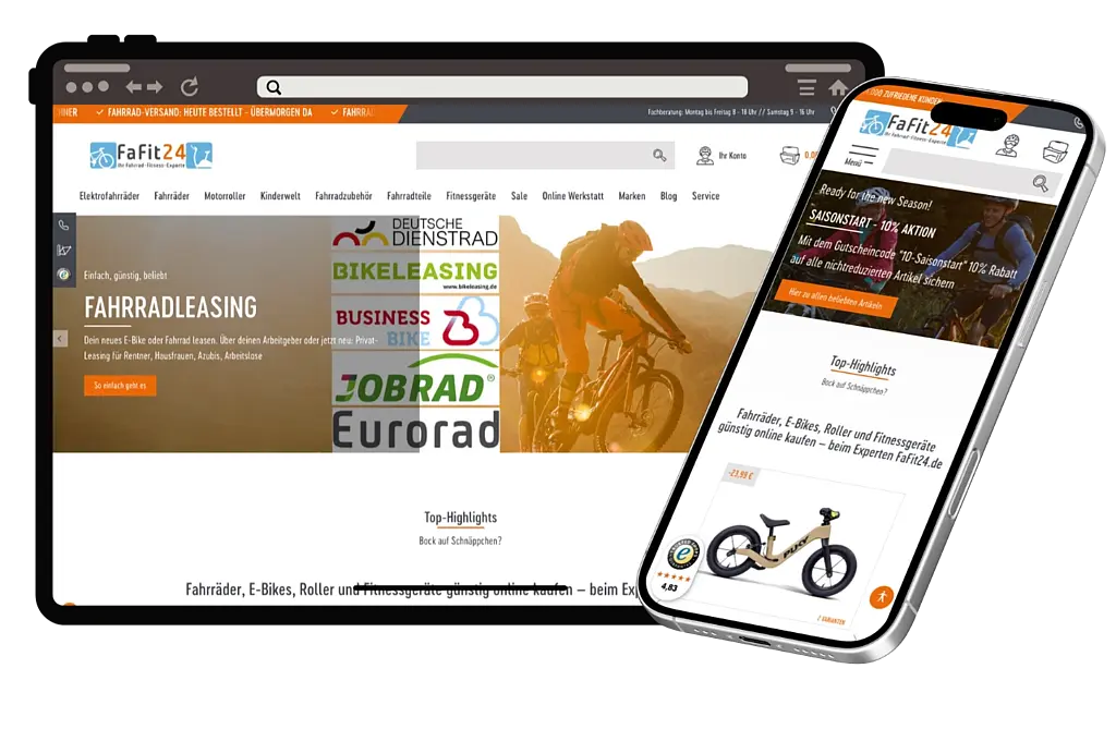 fafit24.de ist der Online-Shop der eRetail-Store GmbH für Fahrräder, E-Bikes und Zubehör. Das Unternehmen bietet ein breites Markensortiment für unterschiedliche Einsatzbereiche und Zielgruppen, von Freizeit bis Radsport. Ergänzend zum Produktangebot unterstützt fafit24.de Kund:innen mit Beratungs- und Serviceleistungen rund um Modellauswahl, passende Rahmengröße und einen fachgerechten Versand der Fahrräder.