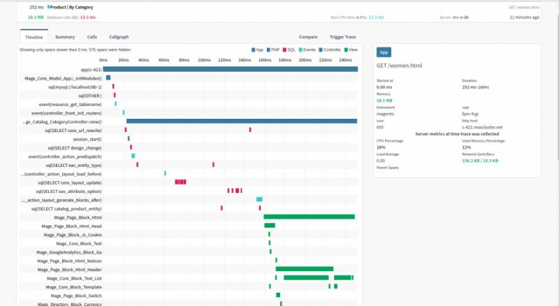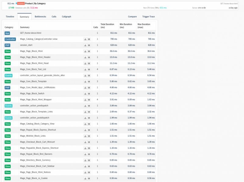 Tideways analysiert serverseitige PHP-Prozesse. Dabei kann das Programm sowohl einzelne Seiten wie auch den gesamten Onlineshop analysieren. Die Stärke von Tideways liegt in der Laufzeitanalyse eines PHP-Aufrufes. Aber auch in anderen Szenarien lassen sich mit Tideways Flaschenhälse analysieren. Wird beispielsweise festgestellt, dass der Shop eine ungewöhnlich hohe Menge an Arbeitsspeicher belegt, lässt sich mit diesem Profiler der verantwortliche Webseitenaufruf lokalisieren. In diesem Fall zeigt Tideways an, welche Aufrufe wie viel Arbeitsspeicher verbraucht haben.