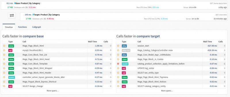 Mit der Compare-Ansicht von Tideways lassen sich zwei Funktionsaufrufe direkt miteinander vergleichen (siehe Screenshot 6: Vergleichsansicht). So lassen sich Änderungen im Code oder im Verhalten schnell analysieren. Bei der Compare-Ansicht können die Daten in einer Timeline (wie es unser Beispiel im Screenshot zeigt), nach Funktionen oder in Callgraphen verglichen werden.