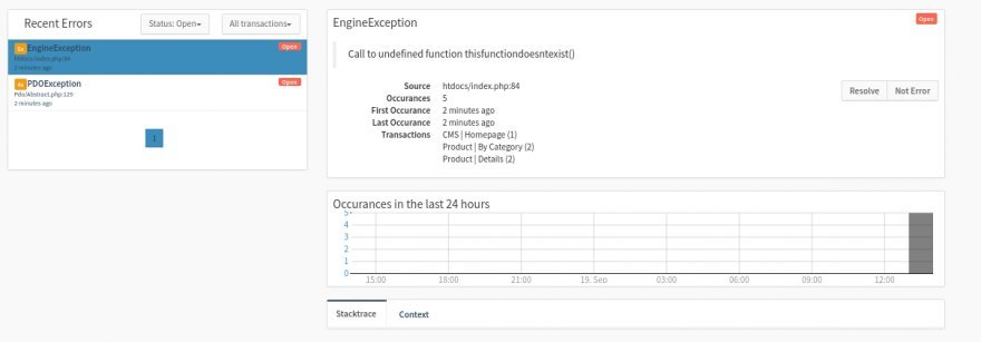 Der Profiler verfügt zudem noch über die Funktion des Fehler-Trackings (siehe Screenshot 8: Fehler-Tracking). In allen Editionen lassen sich damit Fehler lokalisieren, bevor ein Shopbesucher eine Störung bemerkt. Sobald die Fehler entstehen, erhält eine definierte Person ab der Basic-Edition eine Benachrichtigung und kann unmittelbar mit der Analyse beginnen. Die Fehlerwarnung enthält viele wichtige Details, wie zum Beispiel die Quelle, die Häufigkeit des Auftretens, betroffene Transaktionen sowie die Zeitpunkte des ersten und letzten Auftretens.